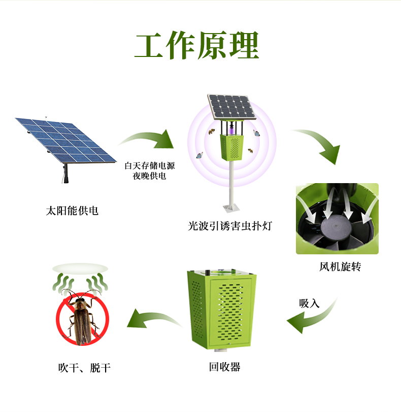 风吸式杀虫灯运用光波引诱害虫扑灯,随后风机旋转造成负压力气旋将小虫子吸进到回收器中,使之吹干、脱干,做到灭虫的目的,以太阳能发电板为基础,白天存储电源,夜晚为杀虫灯给予电源,引诱害虫扑向光源。