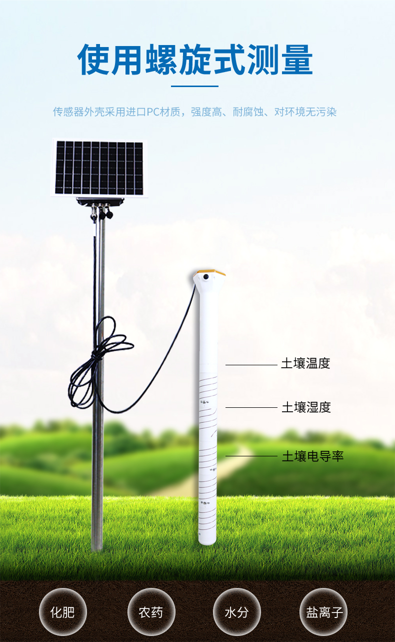 测量原理:通过测量土壤介电常数建立数学模型,设计螺旋式测量电极测量土壤体积含水率数据。
