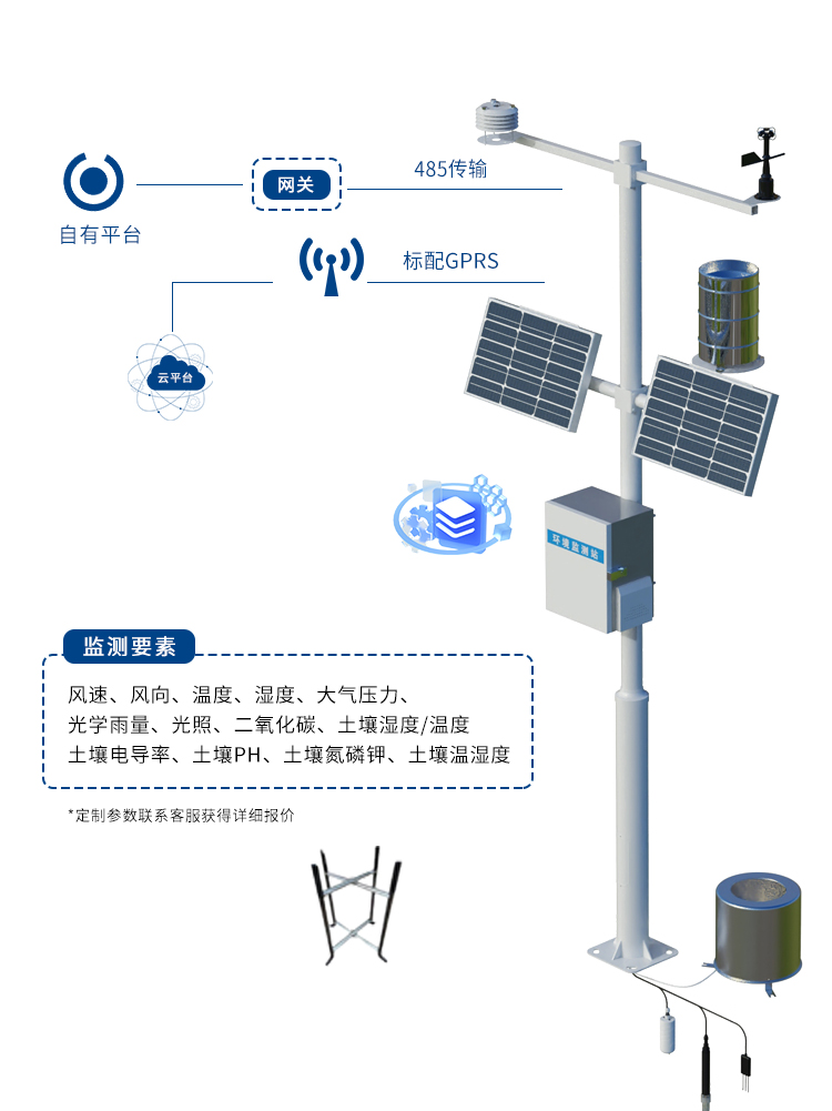 该设备由气象传感器,采集器,太阳能供电系统,立杆支架,云平台五部分组成。免调试,可快速布置,广泛运用于气象、农业、林业、科学考察等领域。